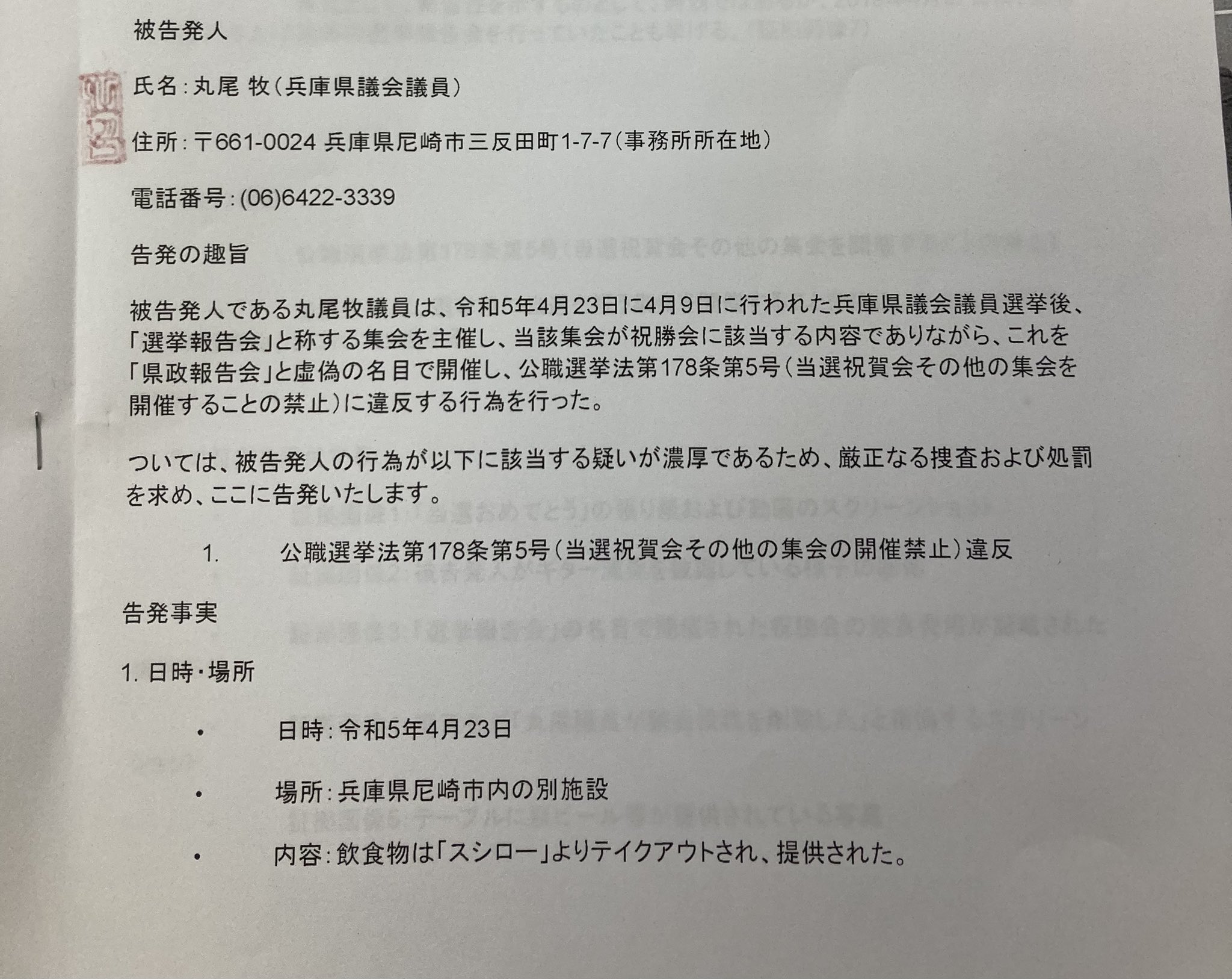@tachibanat 前回の丸尾議員告発状の訂正して、送付しました。明日、兵庫県警本部到着予定です。