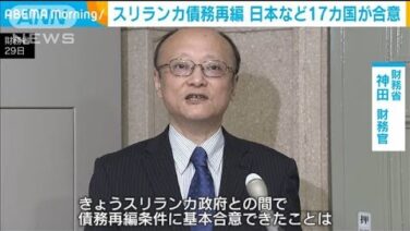 ANN スリランカの債務再編で合意 日本など17カ国 『透明性ある枠組みで』(2023年11月29日) 事実上の債務不履行に陥っているスリランカを巡り、日本など17カ国が参加する債権国会合はスリランカ政府と債務再編で合意しました。 財務省 神田財務官:「きょう、スリランカ政府との間で債務再編条件に基本合意できたことは大きな成果であると考えてお... 2023.11.29 ANN動画