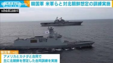 ANN 韓国軍 米軍などと共に対北朝鮮想定の訓練実施(2023年9月14日) 韓国軍はアメリカ軍とともに、主に北朝鮮を想定した合同訓練を実施したと発表しました。 韓国軍は14日、アメリカ、カナダと合同で主に北朝鮮を想定した合同訓練を実施したと発表しました。 訓練には韓国、カナダの護衛艦とアメリカの強襲揚陸艦が参加し、... 2023.09.14 ANN動画