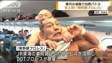 ANN 史上初「新幹線プロレス」開催 車内で白熱バトル(2023年9月19日) 東京・名古屋間を走る東海道新幹線の車内で、史上初のプロレスマッチが行われました。 この企画はJR東海の車両貸し切りサービスを活用して、「DDTプロレス」が東京駅発の「のぞみ」16号車で開催しました。 白熱した試合は37分29秒、大技を繰り出... 2023.09.18 ANN動画