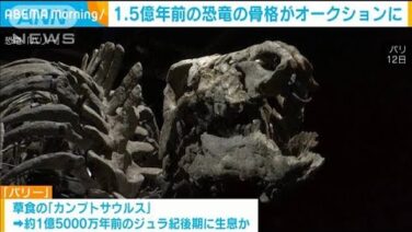 ANN 1.5億年前の恐竜の骨格がオークションに 2億円近くの値段と予想(2023年9月19日) およそ1億5000万年前に生息していたとみられる恐竜の骨格がフランス・パリのオークションに出品されることになりました。2億円近くの値段になると予想されています。 ロイター通信によりますと、「バリー」と名付けられたこの恐竜は、草食の、「カンプ... 2023.09.18 ANN動画