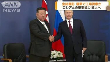 ロシア極東を訪問している北朝鮮の金正恩総書記はプーチン大統領との公式晩餐(ばんさん)会を終え、今後、軍用機の製造工場を視察するなどロシアとの軍事協力をさらに拡大するとみられています。 北朝鮮 金正恩総書記:「プーチン大統領とは朝鮮半島と欧州...
