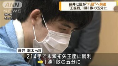 史上初の将棋の「8大タイトル制覇」を目指す藤井聡太七冠が、「王座戦」第2局で永瀬拓矢王座を破り1勝1敗の五分に戻しました。 12日、神戸市で行われた「王座戦」第2局は、お互いに5時間の持ち時間を使い切り1分将棋に入る大熱戦となりましたが、2...