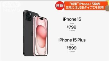 アップルは13日午前、カメラの性能がより高い新型のアイフォーンを発表しました。充電などには初めて、USBタイプCが使われています。 アイフォーン15はピンクなどカラフルな5色から選べ、48メガピクセルのカメラが搭載されています。 これまでは...