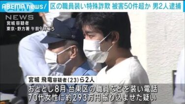 区の職員を装って都内の高齢女性をだまし300万円近くを振り込ませたなどとして、特殊詐欺グループの男2人が逮捕されました。被害は50件以上とみられています。 川崎市の宮城飛竜容疑者(23)ら2人は、おととし8月、仲間と台東区の職員などを装って...
