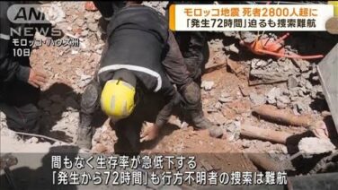 モロッコで発生した地震の死者は2800人を超えました。間もなく発生から72時間が経とうとしていますが、行方不明者の捜索は難航しています。 8日に発生したモロッコ中部を震源とする地震で、これまでに2862人が死亡し、2562人が負傷したとモロ...