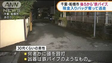 5日夕方、千葉県船橋市の路上で男性が後ろから鉄パイプのようなもので殴られ、現金が入ったバッグを奪われました。 警察によりますと、午後4時すぎ、船橋市八木が谷の路上で仕事帰りで歩いていた30代くらいの男性がいきなり後ろから何者かに頭を殴られま...