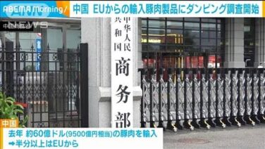 中国商務省はEU(ヨーロッパ連合)から輸入する豚肉や関連製品に対してダンピング調査を始めたと発表しました。EUによる電気自動車の追加関税への対抗措置とみられます。 中国商務省は17日、今回の調査について「国内産業の申請に応えて開始するもの」...