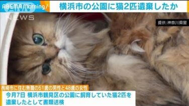 横浜市の公園に猫2匹を遺棄したとして51歳の夫と48歳の妻が書類送検されました。「いけないことだと分かっていた」などと話しています。 長崎市に住む無職の51歳の男性と48歳の女性は今月7日、横浜市鶴見区の公園に、飼育していた猫2匹を遺棄した...