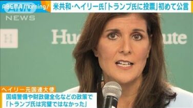 アメリカ共和党でトランプ氏と大統領候補の座を争ったヘイリー元国連大使が選挙戦から撤退後、初めてトランプ氏に投票すると公言しました。アメリカ ヘイリー元国連大使「私はトランプ氏に投票する。トランプ氏は、私に投票して支持し続けてくれている数百万...
