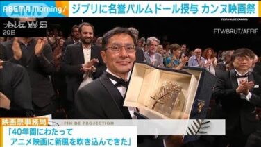 フランスで開催されているカンヌ国際映画祭で20日、「スタジオジブリ」に長年の映画界への貢献をたたえる「名誉パルムドール」が授与されました。 世界三大映画祭のカンヌ国際映画祭で20日、宮崎駿監督らのアニメ映画を制作する「スタジオジブリ」に「名...