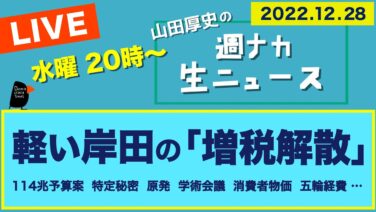 毎週水曜 20時〜山田厚史の週ナカ生ニュース<気になるニュース>・防衛費突出・教育子育て無視の114兆予算案閣議決定・岸田の揺さぶり?「防衛増税の前に解散あり」・薗浦辞職、バタバタ秋葉・杉田いまごろ「解任」・カルト教団2世への「宗教虐待」で...