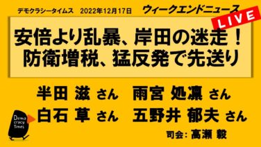 【今週のテーマ】・防衛方針、国民不在で大転換!・金持ち優遇「税制大綱」を決定・宮台真司さん襲撃「公開捜査」に【出演】 半田 滋さん (防衛ジャーナリスト、元東京新聞記者) 雨宮 処凛さん (作家、反貧困活動家) 白石 草さん (ビデオジャー...
