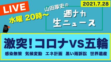 ◆毎週水曜 20時〜生配信!山田厚史の週ナカ生ニュース《激突!コロナVS五輪》【気になるニュース】・究極のテレビコンテンツ、五輪いよいよ開幕・感染急増、一方謝罪なきワクチン削減撤回・浪江町津島原状回復請求等訴訟、30日判決・東電新再建計画、...