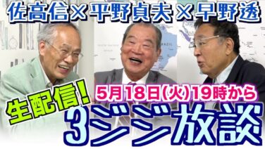 平野貞夫×佐高信×早野透による3ジジ生放談!どこへ転ぶか分からない、はちゃめちゃ3人の生放談をお楽しみください2021年5月18日、生配信