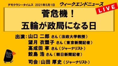今週のテーマ・補選与党全敗 緊急事態宣言・小池が仕掛ける?五輪政局・「台湾」をどうを考える?出演は 山口 二郎さん (法政大学教授)    望月 衣塑子さん (東京新聞記者)    高成田 享さん (ジャーナリスト)    鮫島 浩さん (...