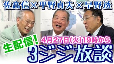 平野貞夫×佐高信×早野透月に一度の3ジジ放談今月もどこへ転ぶか分からない、3人の生放談をお楽しみください