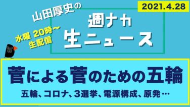 毎週水曜 20時〜、生配信!山田厚史の週ナカ生ニュース《菅による菅のための五輪》【気になるニュース】・北海道長野広島、国政3選挙、自民が全敗・4都府県に再々宣言、医療崩壊明確に・ボロボロ五輪に固執 無観客、自衛隊、看護師・気候変動サミット、...