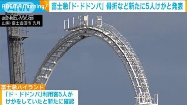 富士急ハイランドはジェットコースター「ド・ドドンパ」で重傷事故が起きた問題で、新たに利用客5人がけがをしていたと発表しました。 山梨県富士吉田市にある富士急ハイランドのジェットコースター「ド・ドドンパ」では去年12月以降、客4人が首の骨など...