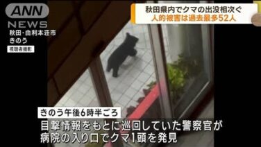 19日、秋田県内でクマの出没が相次ぎました。 警察などによりますと、19日午後6時半ごろ、由利本荘市でクマの目撃情報があり、付近をパトロールしていた警察官が病院の入口にいたクマ1頭を見つけました。 体長50センチほどの子グマとみられ、県や市...